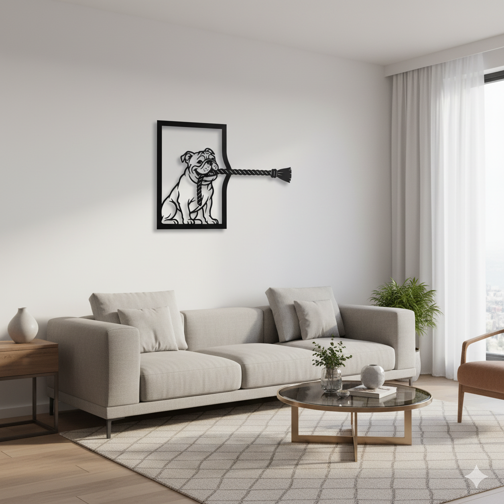 יצירה מלאת חיים והומור, המציגה בולדוג שמח עם חבל בפיו, יוצרת תחושת תנועה ושובבות על הקיר.