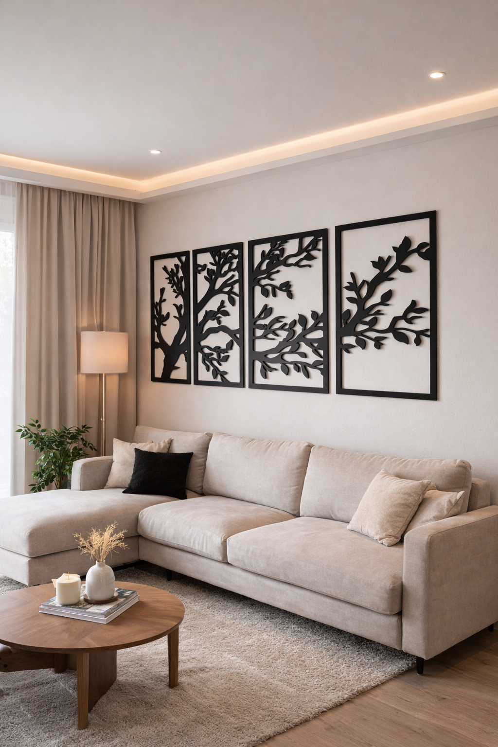 יצירת קיר דקורטיבית ייחודית המורכבת מ־4 פנלים עשויים PVC איכותי בחיתוך CNC מדויק, בעיצוב אלגנטי של ענפי עץ המשתלבים בין כל החלקים ליצירת מראה רציף, טבעי ויוקרתי. החיתוך המדויק מעניק קווים נקיים וגימור מרשים, בעוד שחומר ה־PVC מספק פתרון עמיד, קל משקל ונוח במיוחד להתקנה.