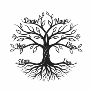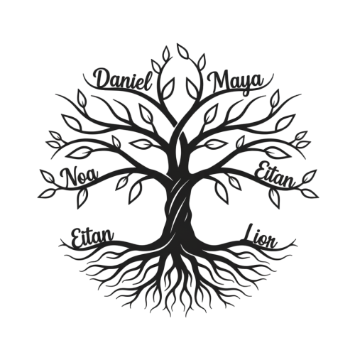 הענפים שוזרים בתוכם את שמות ההורים והילדים, כסמל של אהבה נצחית, חיבור ושורשים עמוקים.