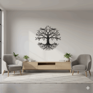 עץ משפחה בעיצוב אישי עשוי פולימר שחור מט בגודל משוער של 60×60 ס״מ.